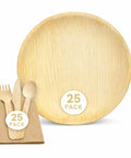 Bundle Contents (125-piece Set): ✓ 25cm Round Palm Leaf Plates (25 pieces) ✓ Wooden Cutlery Set: Forks (25 pieces), Knives (25 pieces), Spoons (25 pieces), Recycled Napkins (25 pieces)